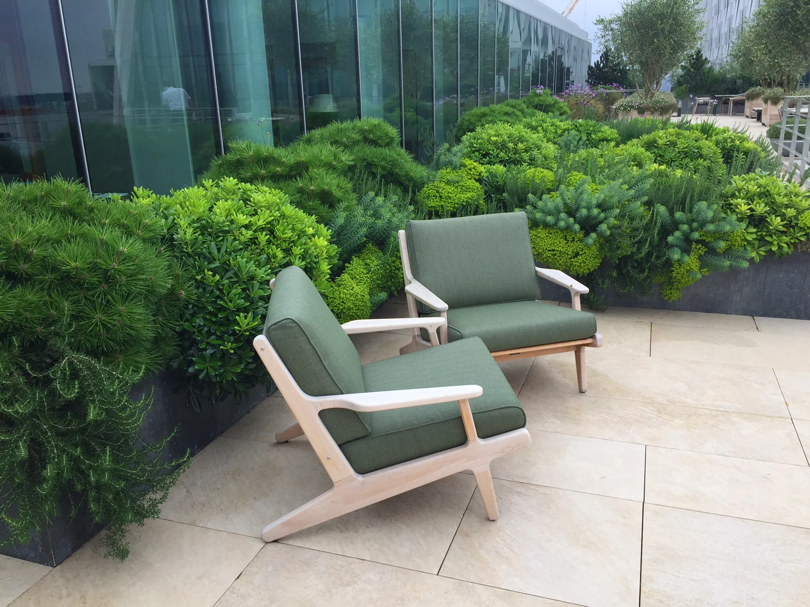Planters were filled with a bespoke lightweight soil specifically formulated to accommodate load-bearing constraints and were planted with a selection of mature olives, pines, multi-stemmed Buxus and herbaceous planting. All materials and trees had to be lifted via a tower crane over the course of two weekends, with 100 lifts over two days. Day-to-day access was restricted to one goods lift for all other materials and the total contract length was six weeks.